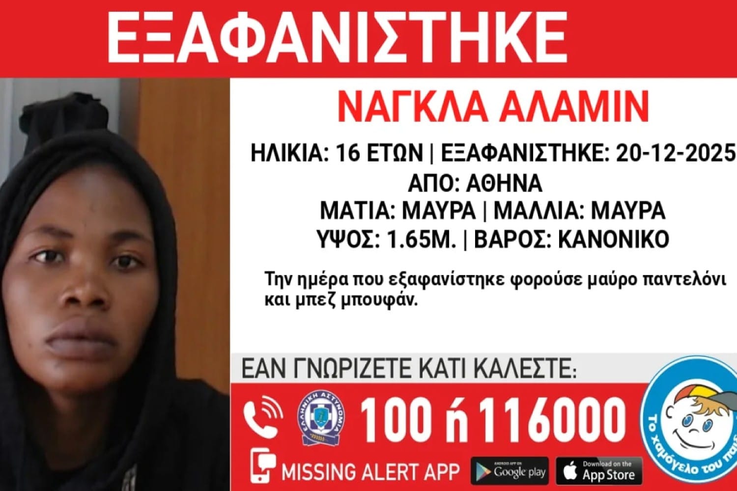 Σύμφωνα με τα στοιχεία, η ανήλικη ονομάζεται Νάγκλα Αλαμίν, έχει ύψος 1,65 μ., βάρος 50 κιλά, έχει μαύρα σγουρά μαλλιά και μαύρα μάτια. Την ημέρα που εξαφανίστηκε φορούσε μαύρο παντελόνι και μπεζ γούνα.