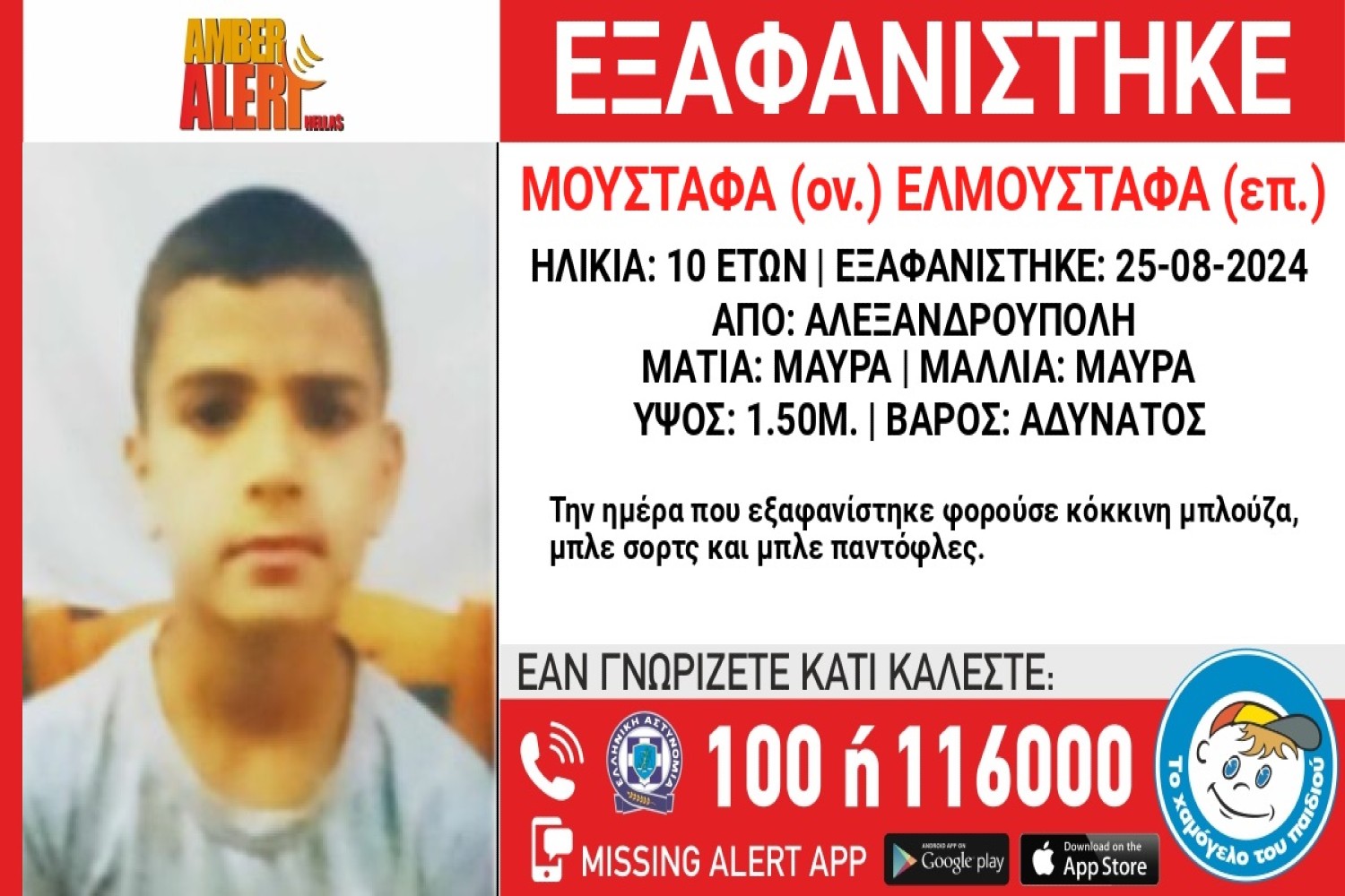 «Το Χαμόγελο του Παιδιού» ενημερώθηκε για την εξαφάνιση του ανήλικου σήμερα, 28.08.2024, και προχώρησε άμεσα στην ενεργοποίηση του μηχανισμού AMBER ALERT HELLAS, κατόπιν εισαγγελικής εντολής. Ο Mustafa. (Μουσταφά) (ον.) Elmustafa (Ελμουσταφά) (επ.) έχει μαύρα μαλλιά, μαύρα μάτια, 1.50 ύψος και είναι αδύνατος. Την ημέρα που εξαφανίστηκε φορούσε κόκκινη μπλούζα, μπλε σόρτς και μπλε παντόφλες.