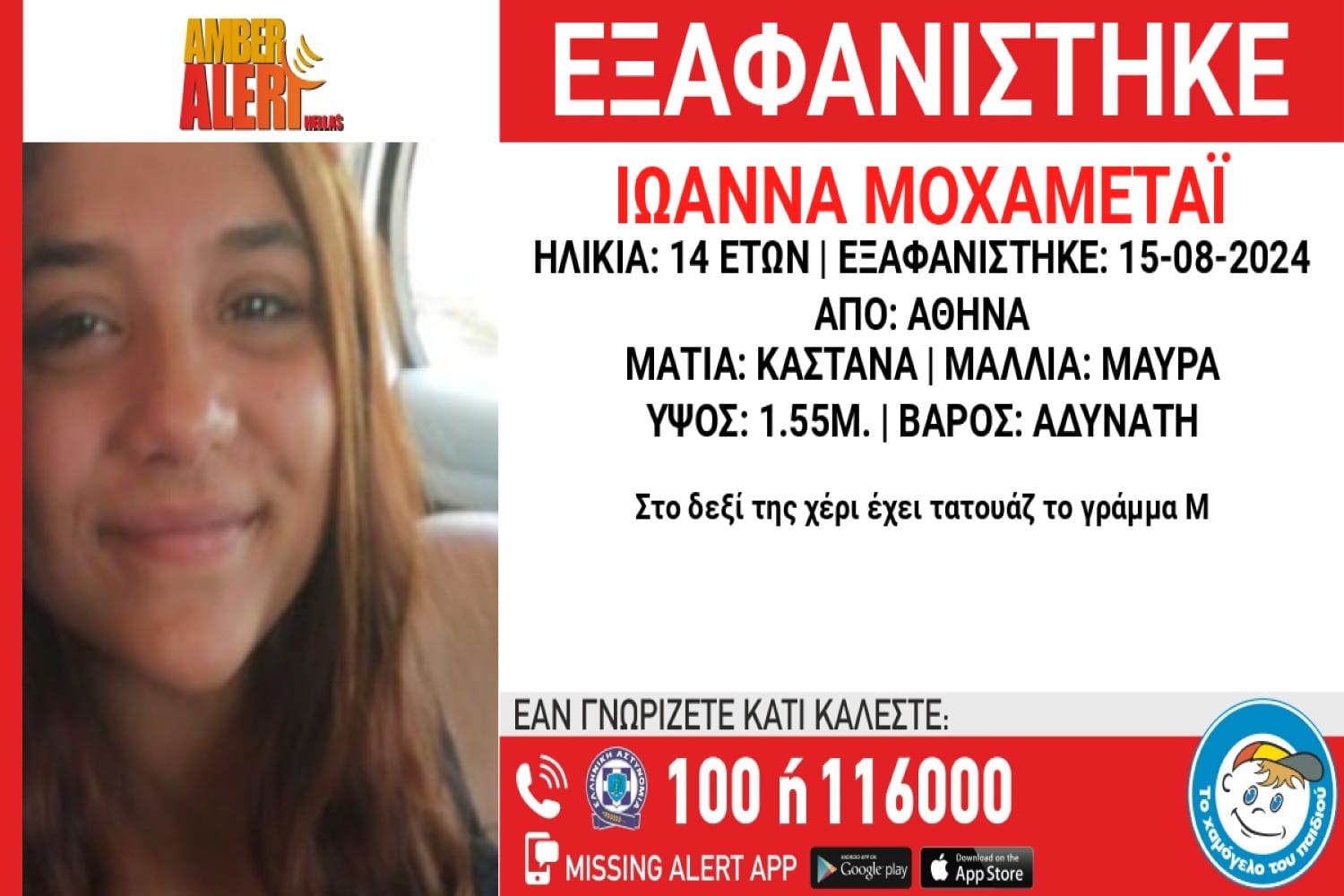 «Στις 15/08/2024 και ώρα 19:25, εξαφανίστηκε από την περιοχή της Αθήνας, η Μοχαμεταϊ Ιωάννα, 14 ετών. «Το Χαμόγελο του Παιδιού» ενημερώθηκε για την εξαφάνιση της ανήλικης Μοχαμεταϊ Ιωάννας, στις 21/08/2024 και προχώρησε στην ενεργοποίηση του μηχανισμού AMBER ALERT HELLAS, κατόπιν εισαγγελικής εντολής, καθώς συντρέχουν λόγοι που θέτουν την ζωή της σε κίνδυνο.