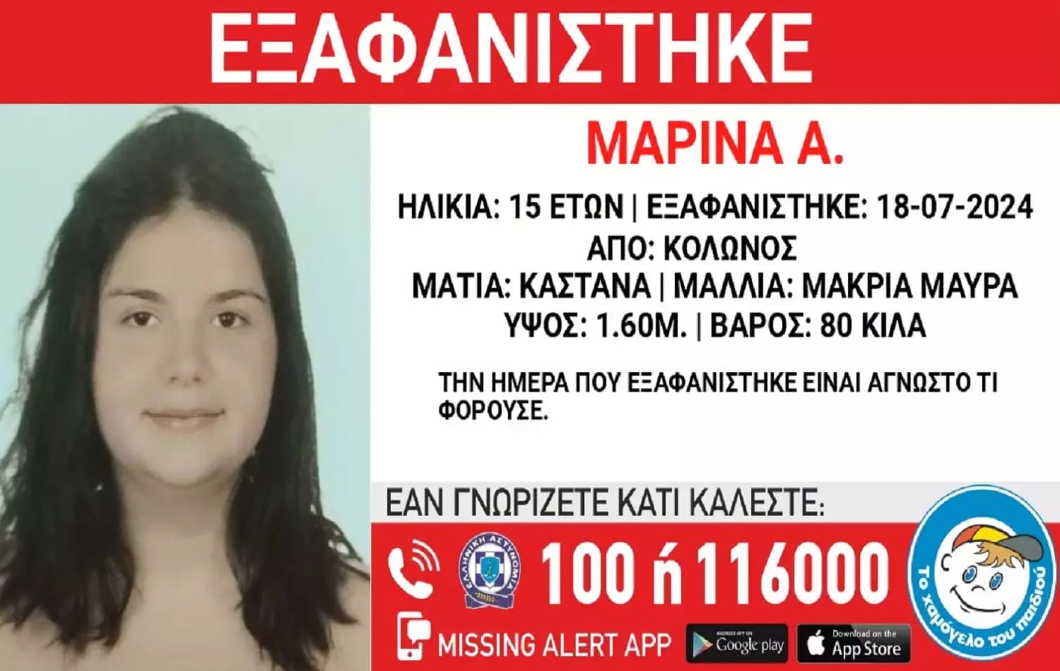 Συναγερμός σήμανε για την εξαφάνιση της 15χρονης Μαρίνας, η οποία εξαφανίστηκε Κολωνό το βράδυ της περασμένης Πέμπτης (18/07/2024) σύμφωνα με το Χαμόγελο του Παιδιού.