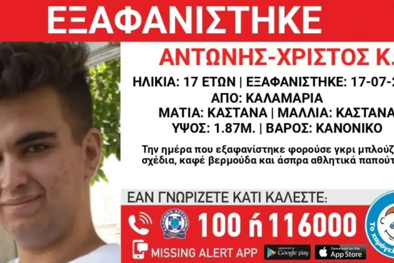«Στις 17/07/2024, πρώτες πρωινές ώρες, εξαφανίστηκε από την Καλαμαριά ο Αντώνης – Χρίστος Κ., ηλικίας 17 ετών. Το “Χαμόγελο του Παιδιού” ενημερώθηκε για την εξαφάνιση και προέβη στην ενεργοποίηση του μηχανισμού Missing Kid Alert, κατόπιν αιτήματος της οικογένειάς του, καθώς ενδέχεται να συντρέχουν σοβαροί λόγοι που θέτουν τη ζωή του σε κίνδυνο.