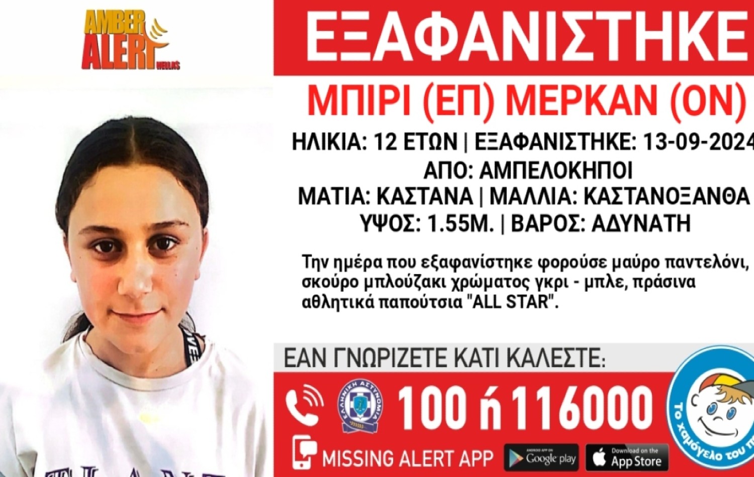 Συναγερμό έχει σημάνει «Το Χαμόγελο του Παιδιού», για την εξαφάνιση της 12χρονης Μέρκαν Μπιρί, η οποία εξαφανίστηκε σήμερα, Παρασκευή 13 Σεπτεμβρίου, πρωινές ώρες, από την περιοχή των Αμπελοκήπων.