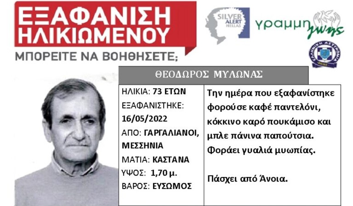 Ο 73χρονος Θεόδωρος Μυλωνάς εξαφανίστηκε από τους Γαργαλιάνους Μεσσηνίας.