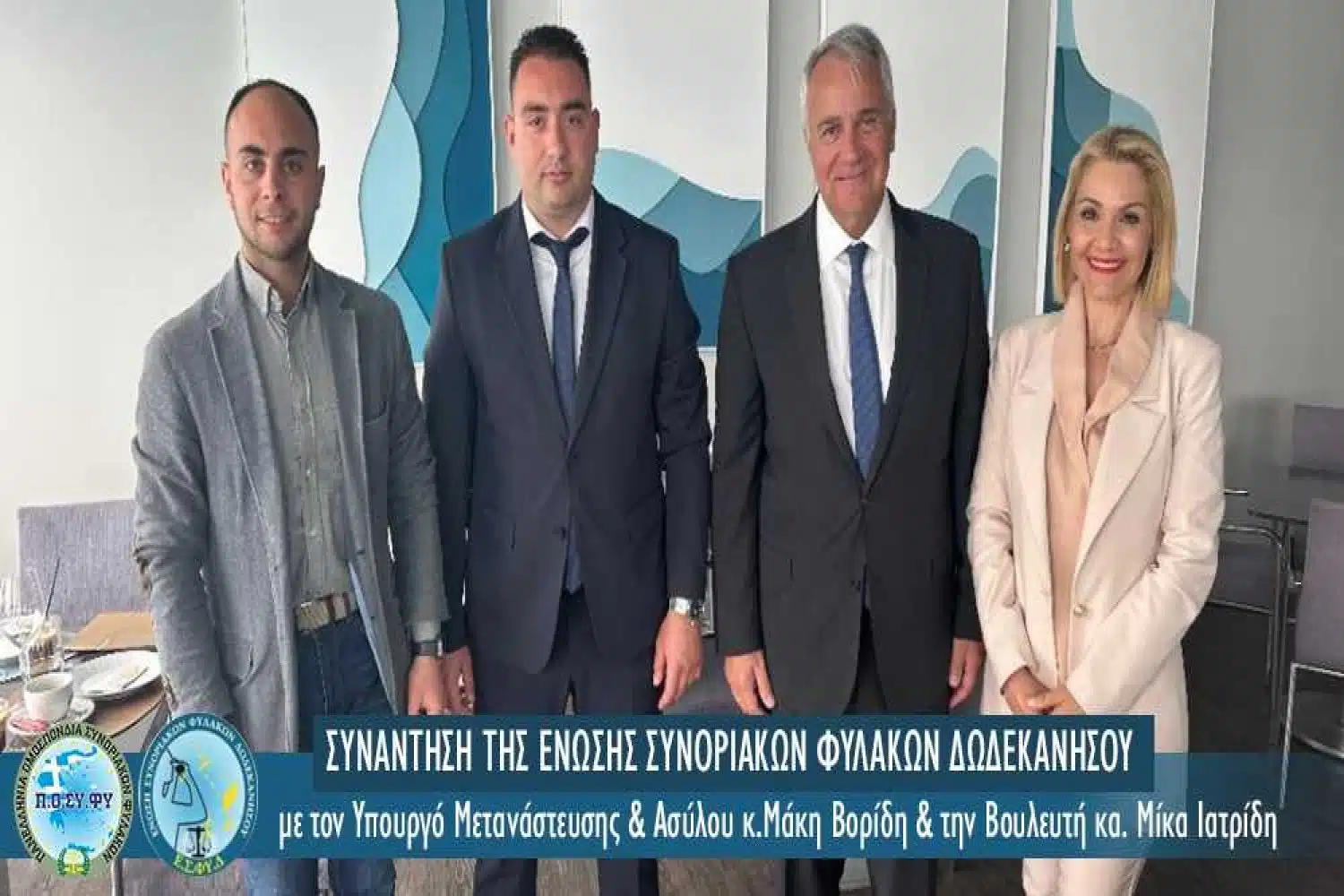Τον Υπουργό Μετανάστευσης & Ασύλου κ. Μάκη Βορίδη συνάντησε χθες μετά το πέρας της παρέλασης, ενόψει της Εθνικής Επετείου του 1821, ο Πρόεδρος της Ένωσης Συνοριακών Φυλάκων Δωδεκανήσου κ. Ιωάννης Ρώτας, συνοδευόμενος από την Βουλευτή Δωδεκανήσου κα Μίκα Ιατρίδη & τον Οργανωτικό Γραμματέα της Ε.Σ.ΦΥ.Δ. κ. Ιωάννη Βουδούρη.