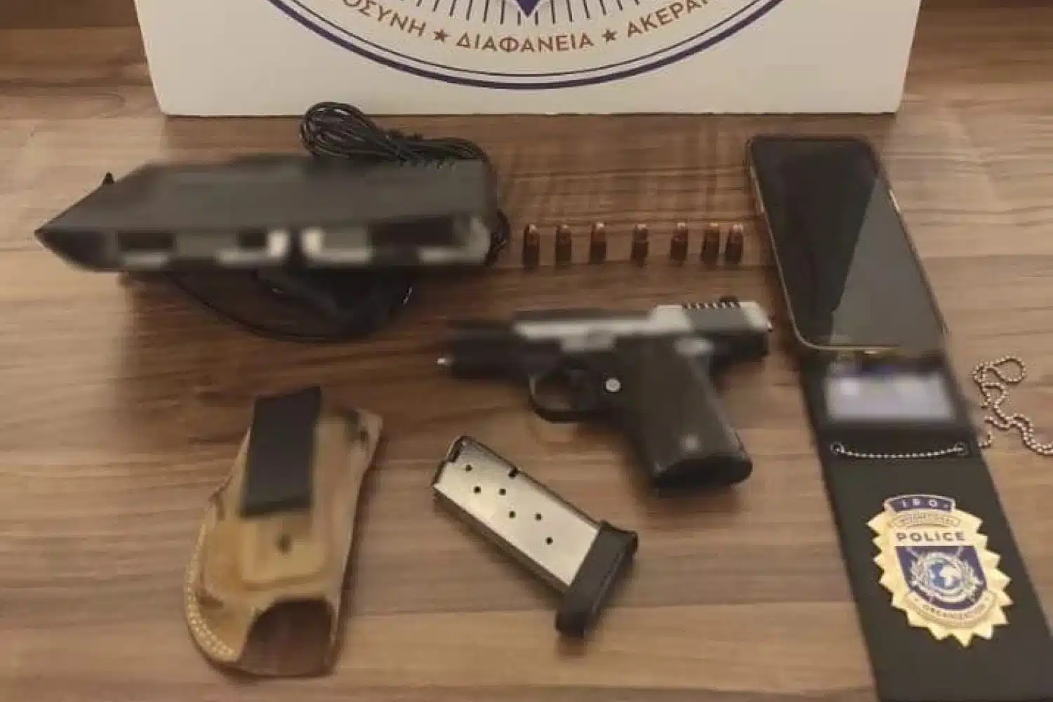 - πιστόλι, σε δερμάτινη εσωτερική θήκη, με γεμιστήρα που περιείχε 7 φυσίγγια,