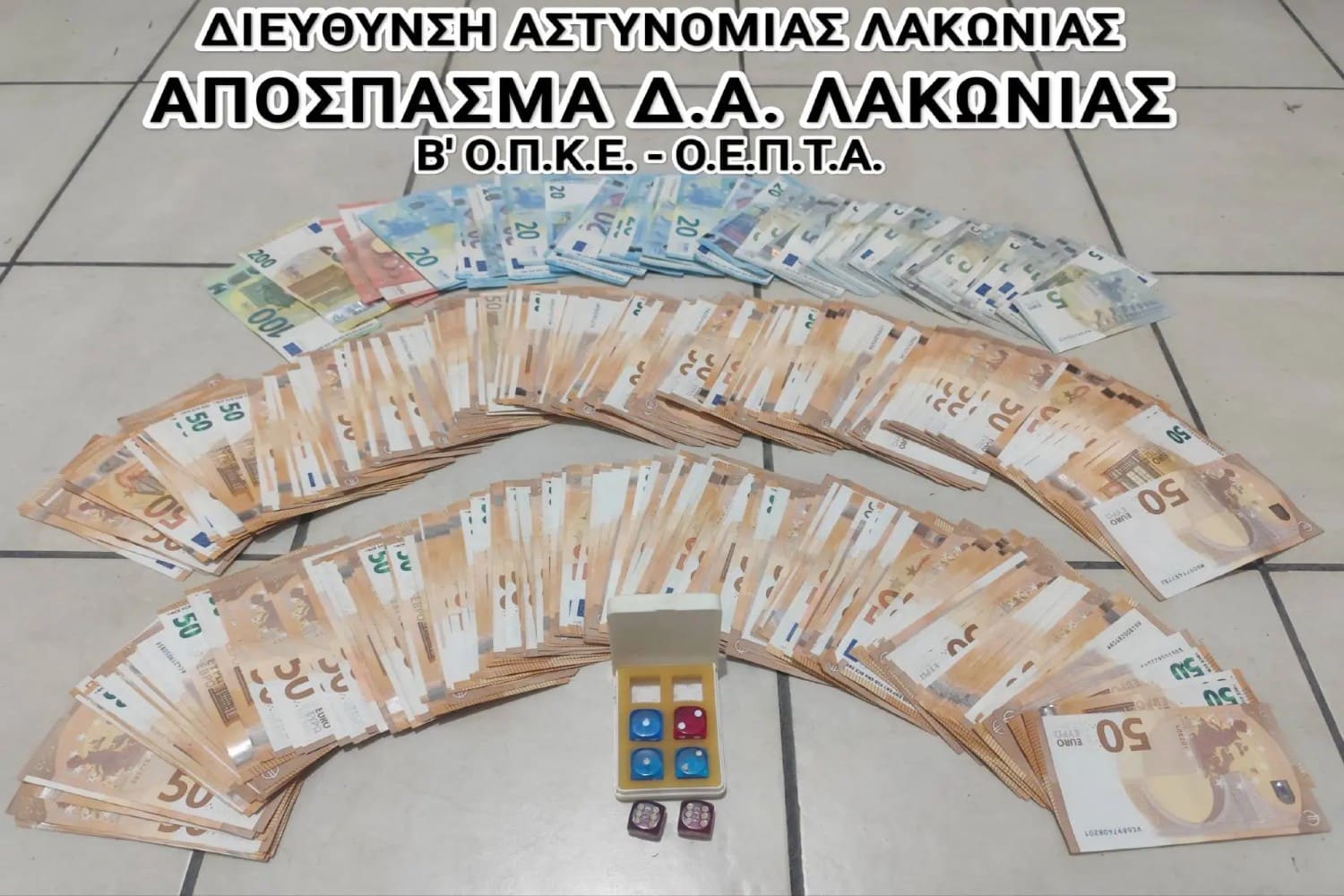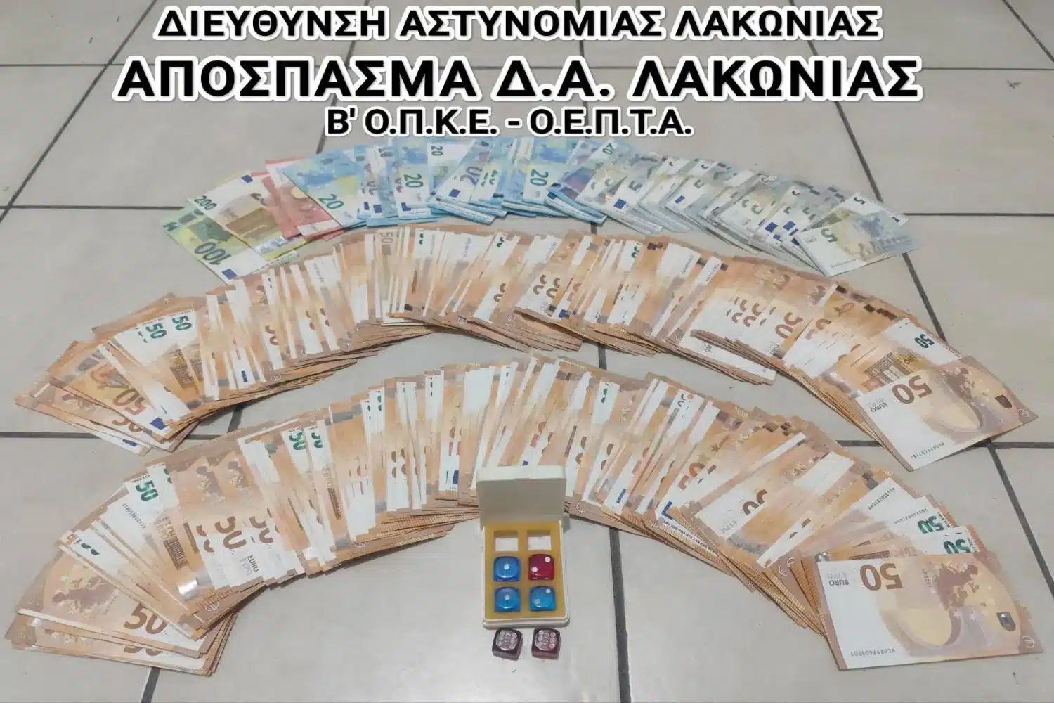 Κατά τον έλεγχο βρέθηκαν και κατασχέθηκαν τρία ζεύγη κύβοι – ζάρια και το χρηματικό ποσό των 18.635 ευρώ, ως προερχόμενο από τη διενέργεια παράνομων παιχνιδιών.