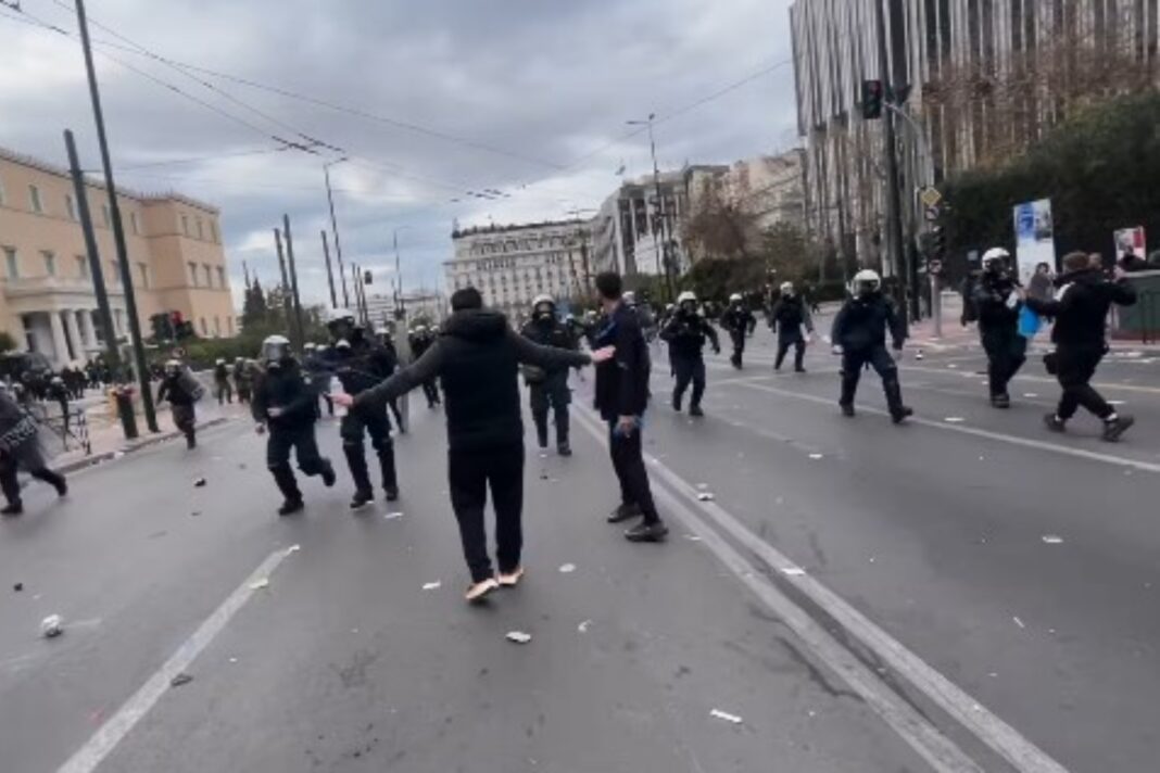 Όπως φαίνεται στα χαρακτηριστικά πλάνα άνδρες των ΜΑΤ τρέχουν προς το μέρος των διαδηλωτών.