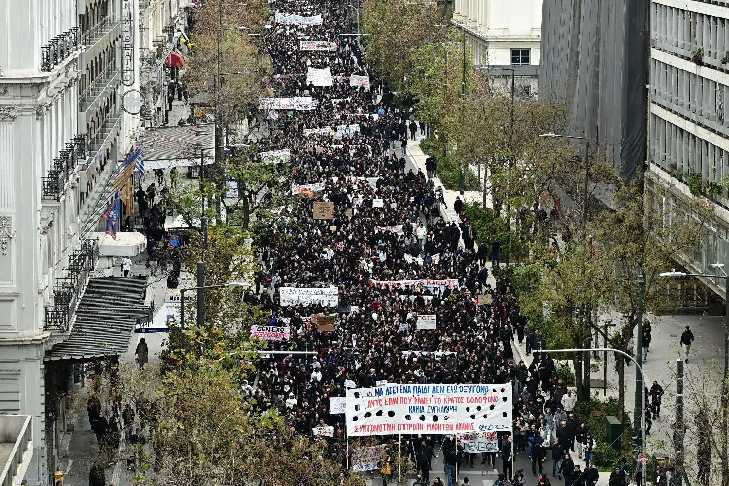 Το σύνθημα που κυριαρχεί είναι εκείνο που αναγράφεται στο πανό της Συντονιστικής Επιτροπής Μαθητών Αθήνας «Να λέει ένα παιδί: Δεν έχω οξυγόνο – Αυτό είναι που κάνει το κράτος δολοφόνο! Καμία συγκάλυψη».