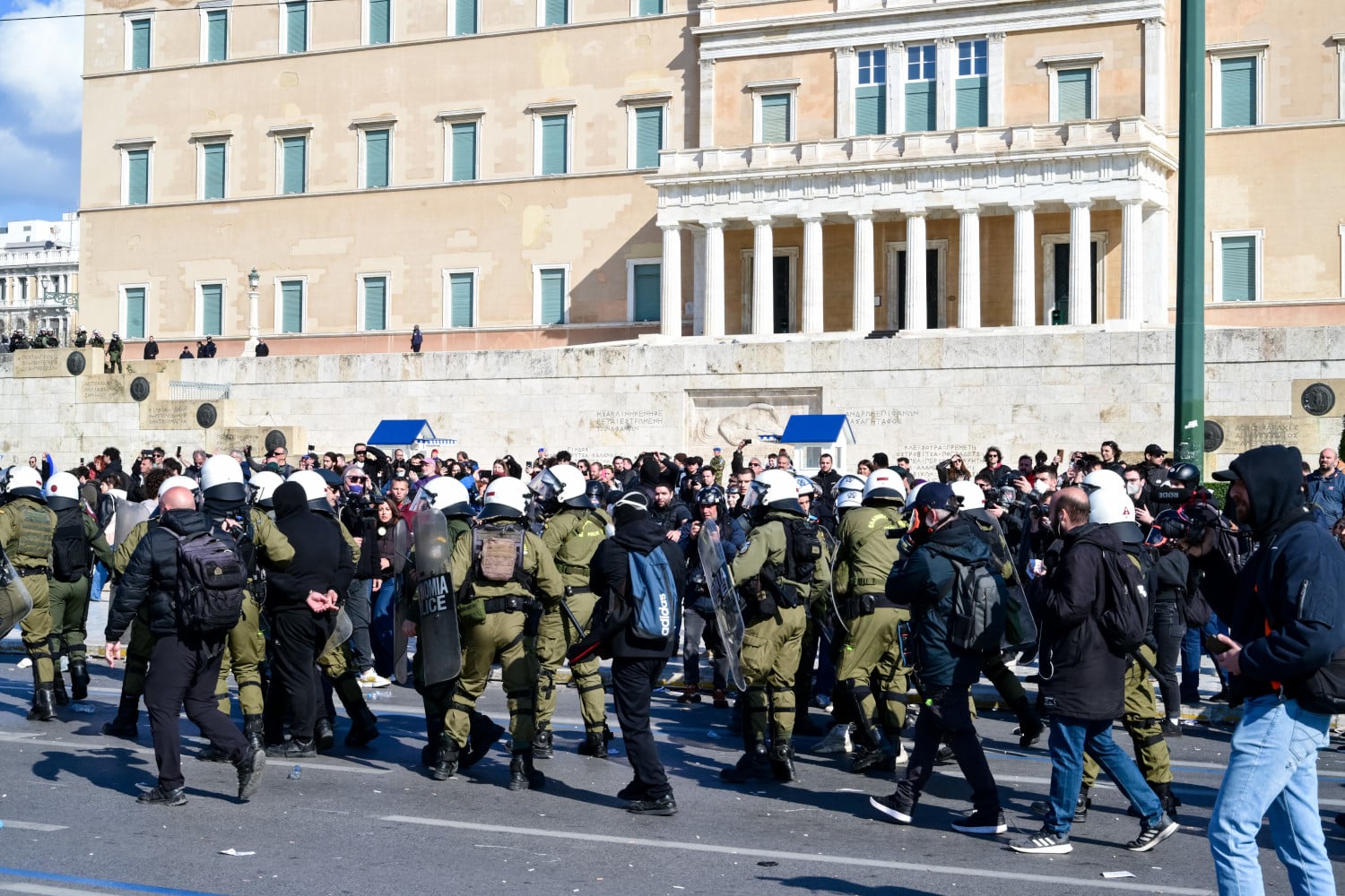 Μετά το πέρας των ομιλιών, ομάδα περίπου 50 ατόμων, που παρείσφρησε στη συγκέντρωση, ευρισκόμενοι στην Πλατεία Συντάγματος, αφού κάλυψαν τα χαρακτηριστικά των προσώπων τους με κουκούλες και μάσκες και εκμεταλλευόμενοι τη σταδιακή αποχώρηση των πολιτών, κινήθηκαν τρέχοντας προς τη Λεωφόρο Βασιλίσσης Αμαλίας και έπειτα προς τα Προπύλαια, ρίπτοντας ταυτόχρονα πέτρες και άλλα αντικείμενα προς τις αστυνομικές δυνάμεις.