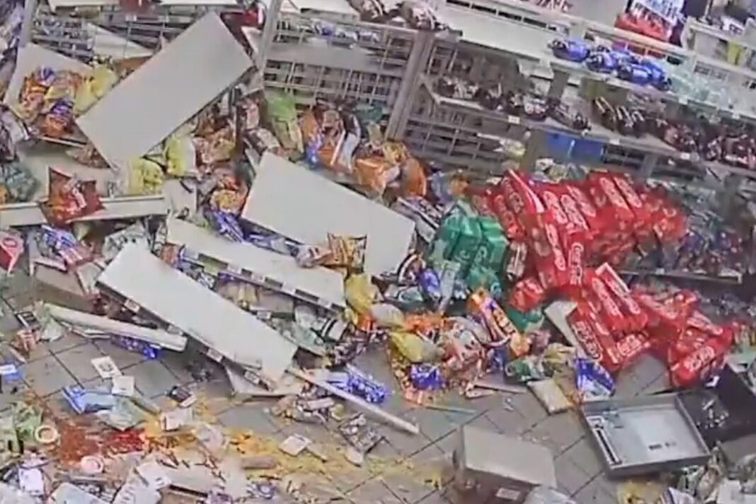 Γκρέμισαν τοίχους και ράφια με αποτέλεσμα οι διάδρομοι του καταστήματος να γεμίσουν με προϊόντα.
