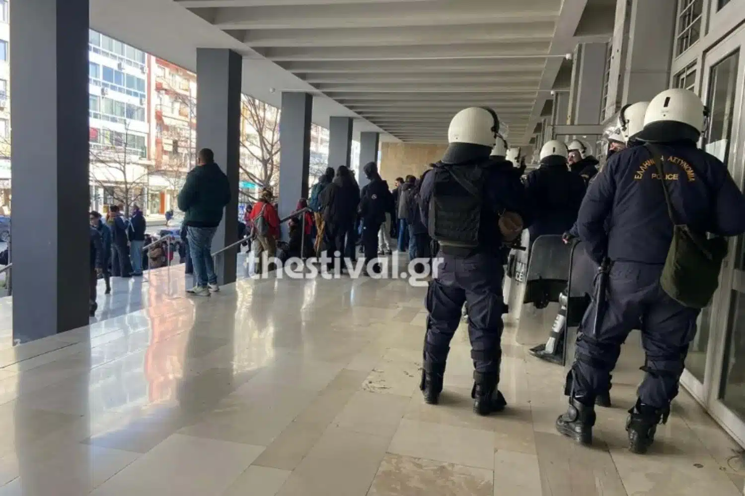 Έξω από το Δικαστικό Μέγαρο Θεσσαλονίκης πραγματοποιείται συγκέντρωση αλληλεγγύης στους 38 συλληφθέντες, όπως αναφέρει το thestival.