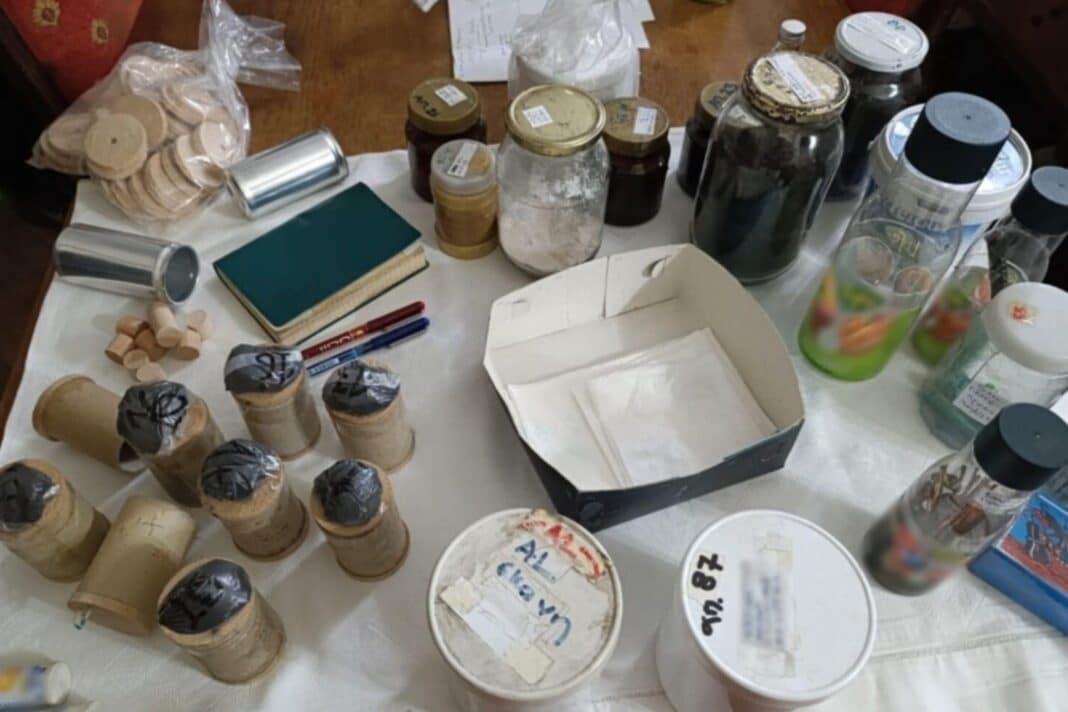 μεγάλες ποσότητες υλικών που σχετίζονται με την παρασκευή πυρίτιδας, καθώς και πολυάριθμες συσκευασίες που περιείχαν είτε έτοιμη μαύρη πυρίτιδα (πλέον των 13 κιλών), είτε πρόδρομες χημικές ουσίες όπως νιτρικό κάλιο, θείο, ξυλάνθρακα, σκόνες μετάλλων (αλουμινίου, μαγνησίου), υγρά χημικά όπως μεθανόλη, διαιθυλαιθέρας,