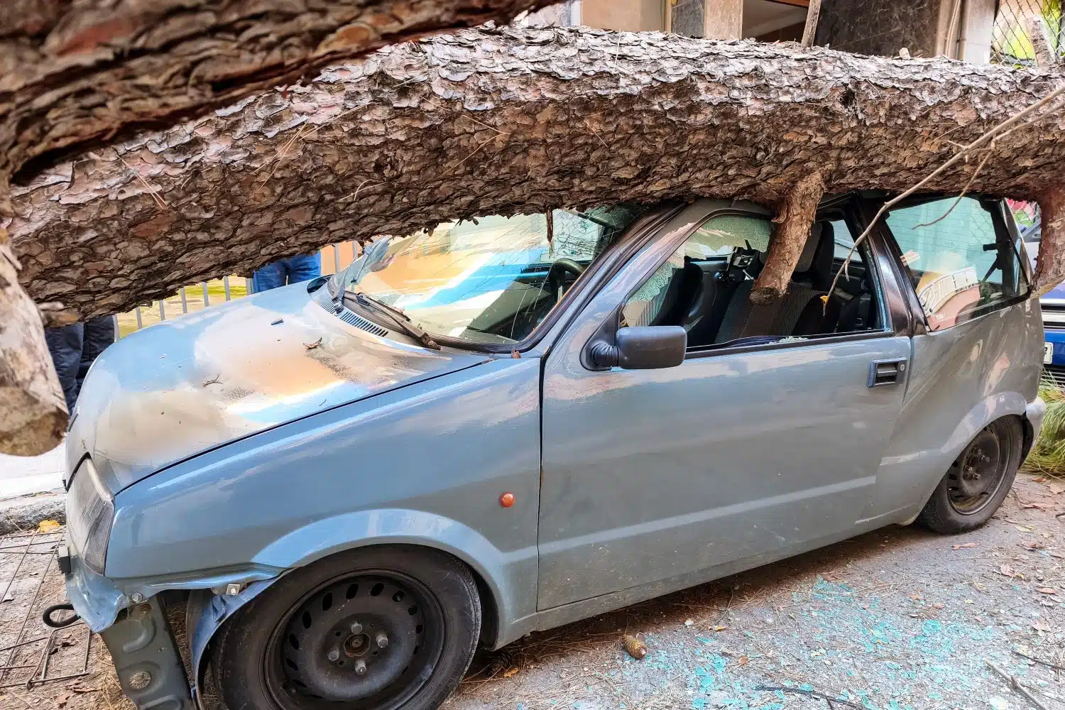 Το μεγάλο πεύκο καταπλάκωσε δύο ΙΧ, χωρίς ευτυχώς να υπάρξουν τραυματισμοί.