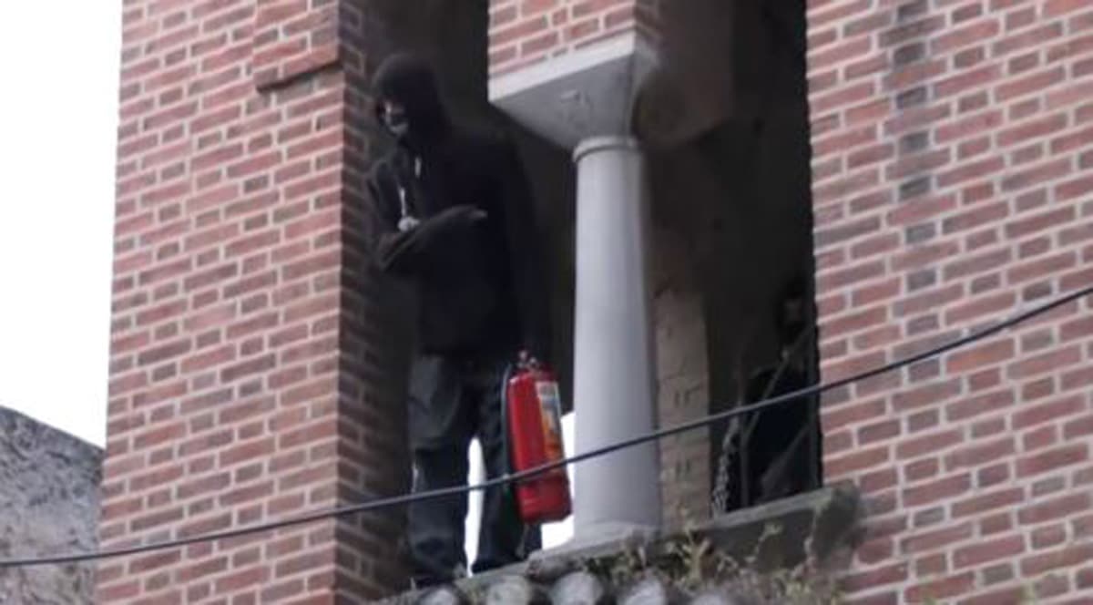 Οι δύο κουκουλοφόροι ανέβηκαν επάνω στην εκκλησία του Αγίου Μηνά, και πηδούσαν από ταράτσα σε ταράτσα ενώ πετουσαν αντικείμενα, ζητώντας να απομακρυνθούν από το σημείο οι αστυνομικοί για να κατέβουν.