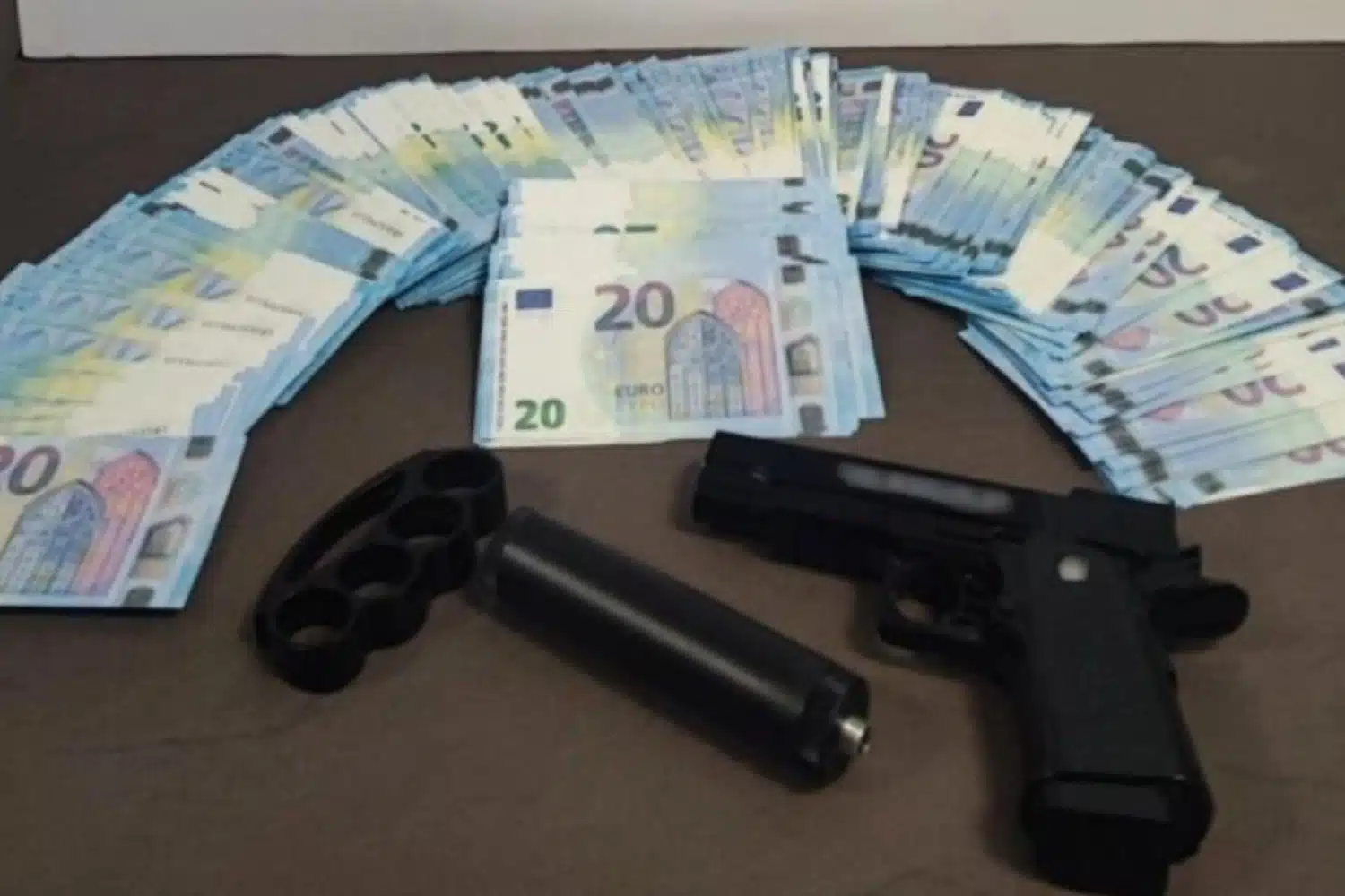 Συγκεκριμένα, κατασχέθηκαν 723 πλαστά χαρτονομίσματα ονομαστικής αξίας 20 ευρώ το καθένα, καθώς και ένα πιστόλι τύπου «ρέπλικα» με σιγαστήρα και μία σιδερογροθιά.
