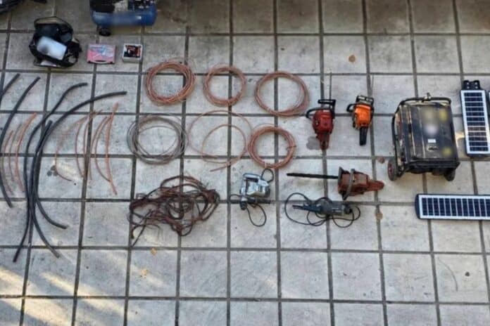 Όπως προκύπτει από τις φωτογραφίες που έδωσε στη δημοσιότητα για την υπόθεση η Ελληνική Αστυνομία, οι δράστες έκλεβαν αλυσοπρίονα, γεννήτριες, ηλιακές λάμπες ακόμη και ηχεία και ό,τι άλλο έβρισκαν στις αποθήκες που άνοιγαν.