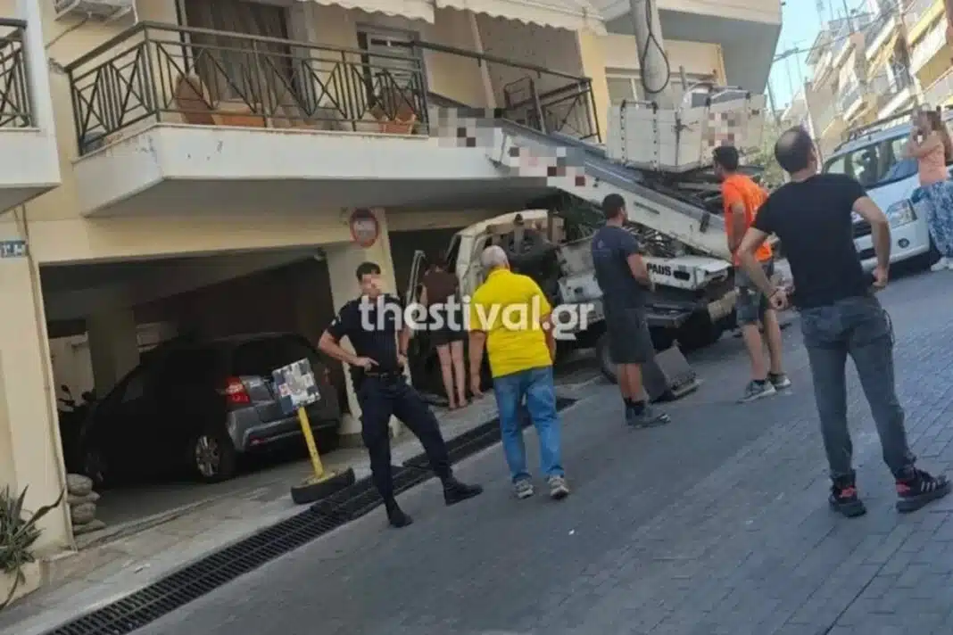 Ένα σοβαρό περιστατικό σημειώθηκε το απόγευμα της περασμένης Δευτέρας (28/7) στην περιοχή των Συκεών στη Θεσσαλονίκη όταν ένα γερανοφόρο όχημα εισήλθε σε πιλοτή πολυκατοικίας και τον γερανό να πέφτει στο μπαλκόνι του πρώτου ορόφου.