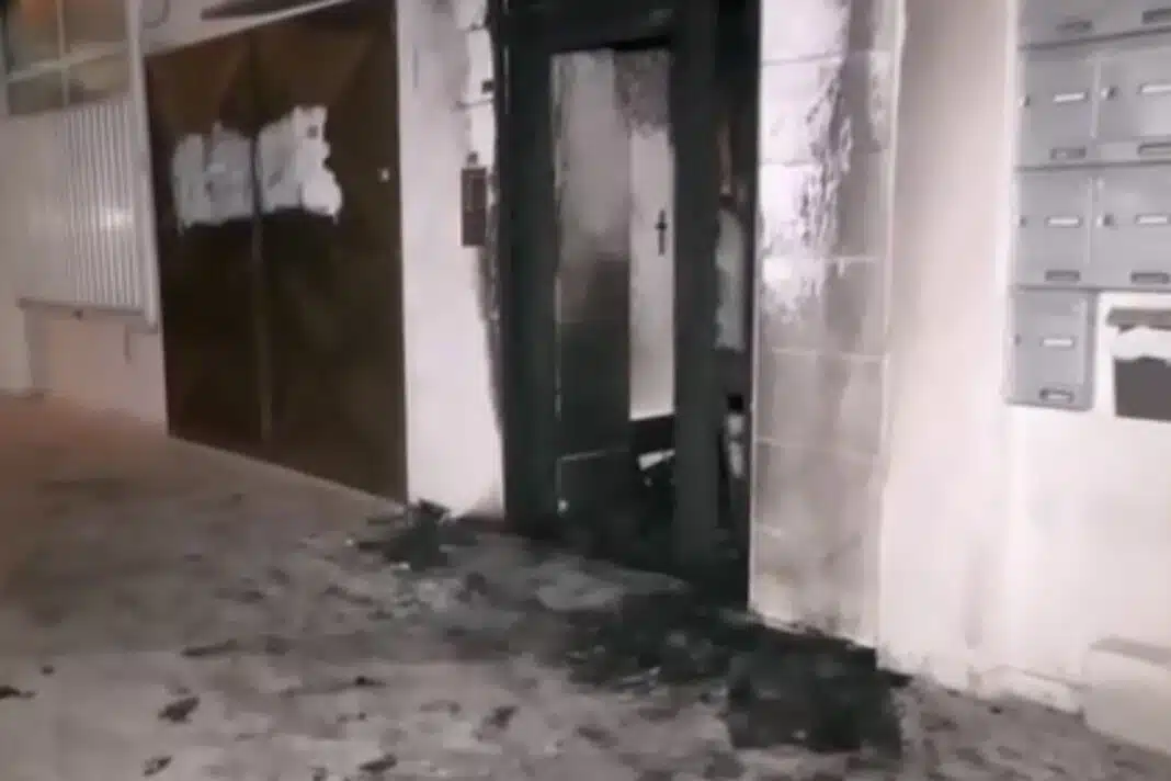 Η φωτιά προκάλεσε σοβαρές υλικές ζημιές στην είσοδο της πολυκατοικίας.