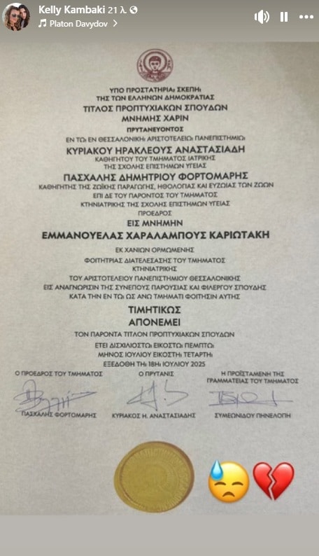 Η Έμμα, που σπούδαζε στο ΑΠΘ, θα ολοκλήρωνε σήμερα τις σπουδές της, αν η ζωή της δεν κοβόταν άδικα και πρόωρα. Το πτυχίο της απονεμήθηκε «εις μνήμην» από το πανεπιστήμιο, σε μια συμβολική αλλά φορτισμένη τελετή, όπως αναφέρει η ιστοσελίδα thestival.gr.