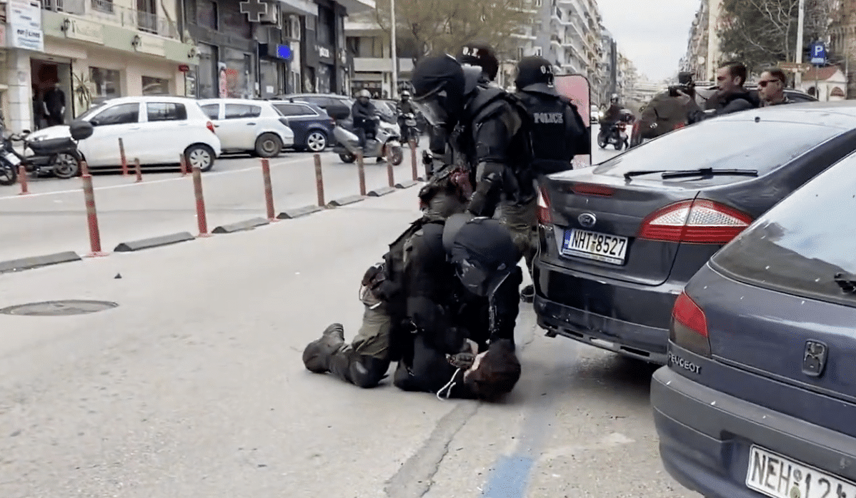 Του κρατά τα χέρια και τον ταρακουνά. Ο διαδηλωτής προσπαθεί να κουνηθεί, αλλά ο άνδρας των ΜΑΤ του πιέζει το κεφάλι στο έδαφος.