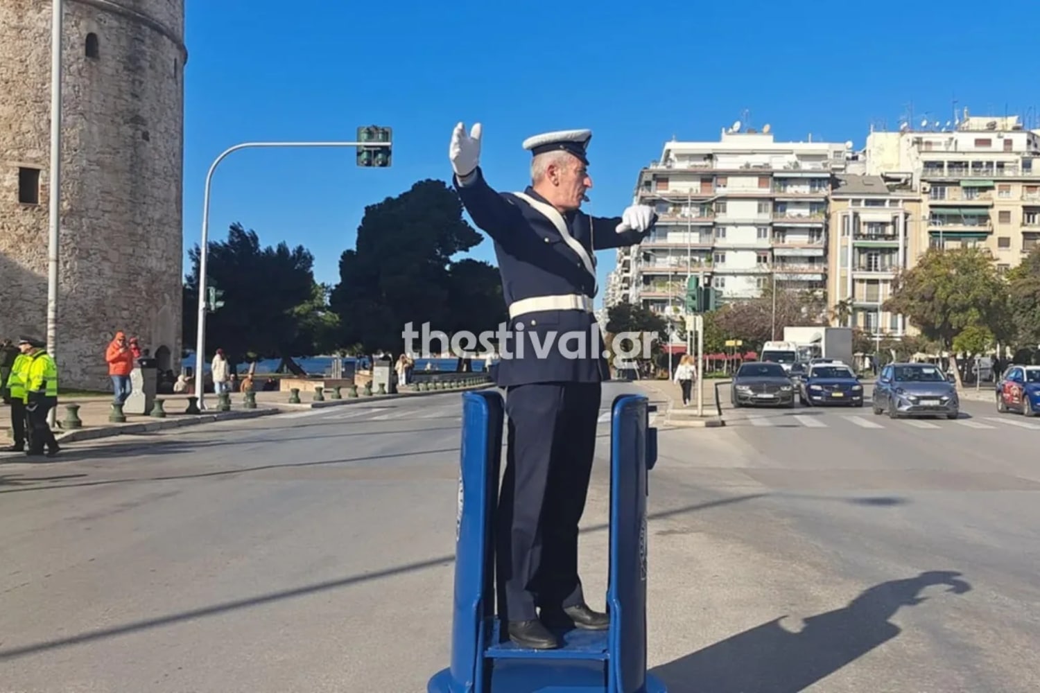 Στις 11.30 το πρωί ο τροχονόμος της Τροχαίας Θεσσαλονίκης ανέβηκε στο βαρέλι και άρχισε να ρυθμίζει την κυκλοφορία των οχημάτων μπροστά από το Λευκό Πύργο με τους οδηγούς να τον χαιρετούν και άλλους να κορνάρουν.