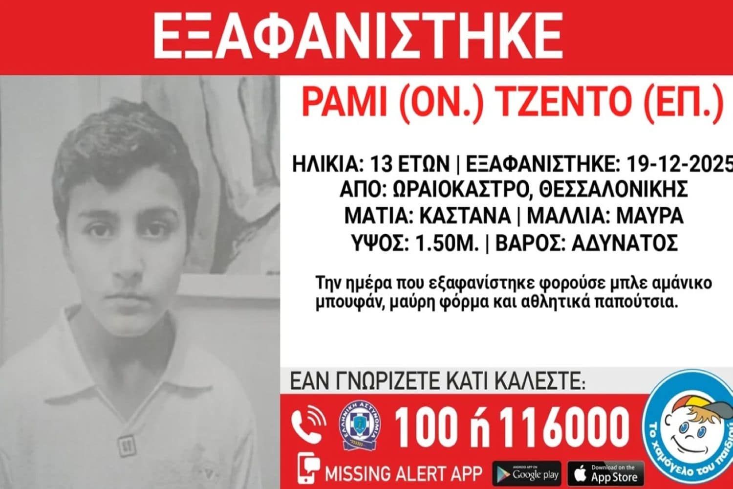 Συναγερμός έχει σημάνει για την εξαφάνιση του 13χρονου Τζέντο Ραμί από χώρο φιλοξενίας ασυνόδευτων ανηλίκων στο Ωραιόκαστρο Θεσσαλονίκης.