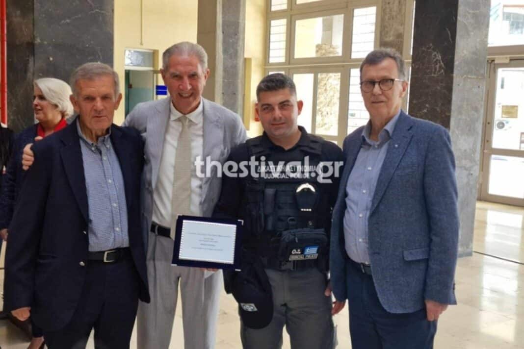 Την ηρωική πράξη του δικαστικού αστυνομικού τίμησαν το μεσημέρι της Παρασκευής (31/10) δικαστικοί υπάλληλοι της Θεσσαλονίκης, αλλά και ο Σύλλογος Συνταξιούχων Δικαστικών Υπαλλήλων, σε ειδική εκδήλωση που πραγματοποιήθηκε στο αίθριο του Δικαστικού Μεγάρου, παρουσία φορέων της δικαιοσύνης, των συναδέλφων και της οικογένειάς του.