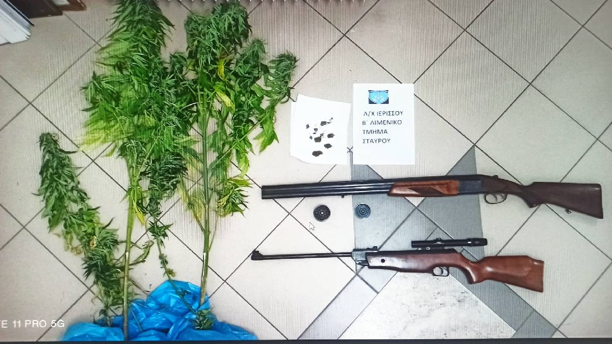 Ειδικότερα, όπως μεταδίδει η ΕΡΤ, μια μικρή φυτεία ινδικής κάνναβης με τρία γραμμάρια κατεργασμένης κάνναβης, υλικά τριψίματος και δύο αδήλωτα όπλα, μια δίκαννη καραμπίνα κι ένα αεροβόλο με διόπτρα εντόπισαν αξιοποιώντας πληροφορίες και μετά από έρευνα σε οικία στην Ασπροβάλτα το Λιμενικό Τμήμα Σταυρού Θεσσαλονίκης.