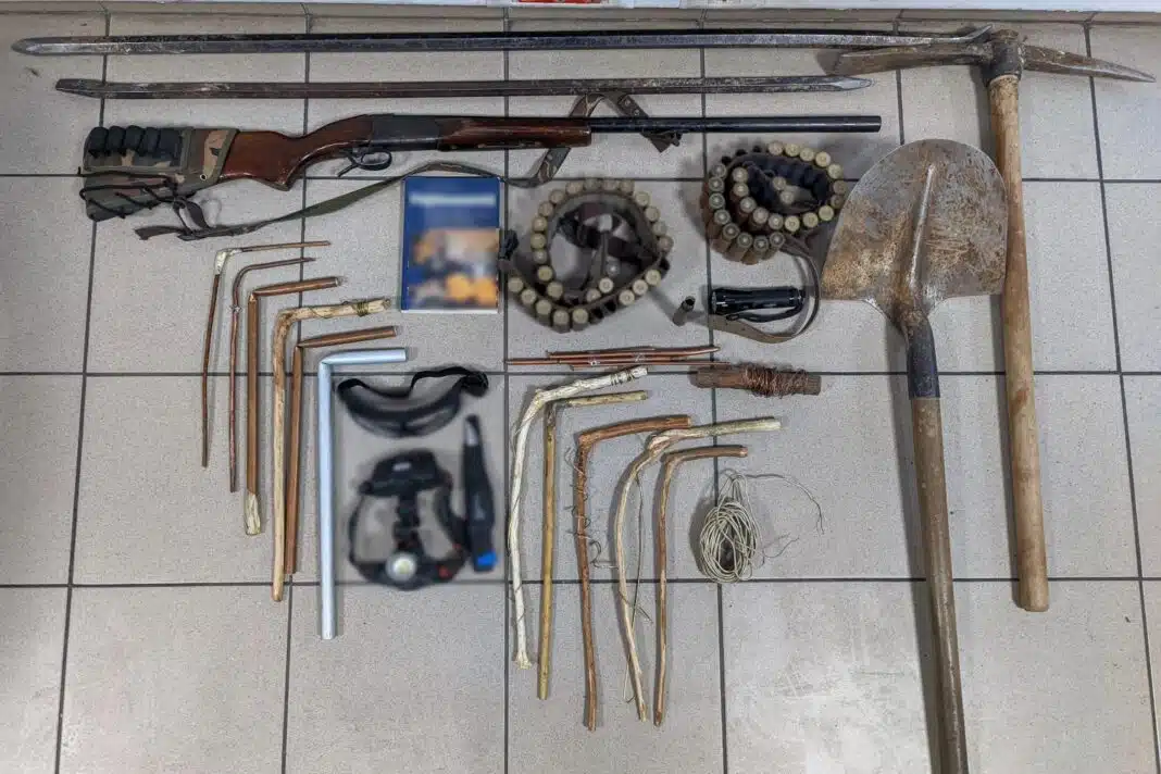 Σε έρευνες, μεταξύ άλλων, βρέθηκαν και κατασχέθηκαν εργαλεία πρόσφορα για ανασκαφές (φτυάρι, αξίνα, δύο μεταλλικοί λοστοί), κυνηγετική καραμπίνα με 50 φυσίγγια, μαχαίρι, καθώς και αυτοσχέδιες ξύλινες και μεταλλικές ράβδοι διασκόπησης υπεδάφους.