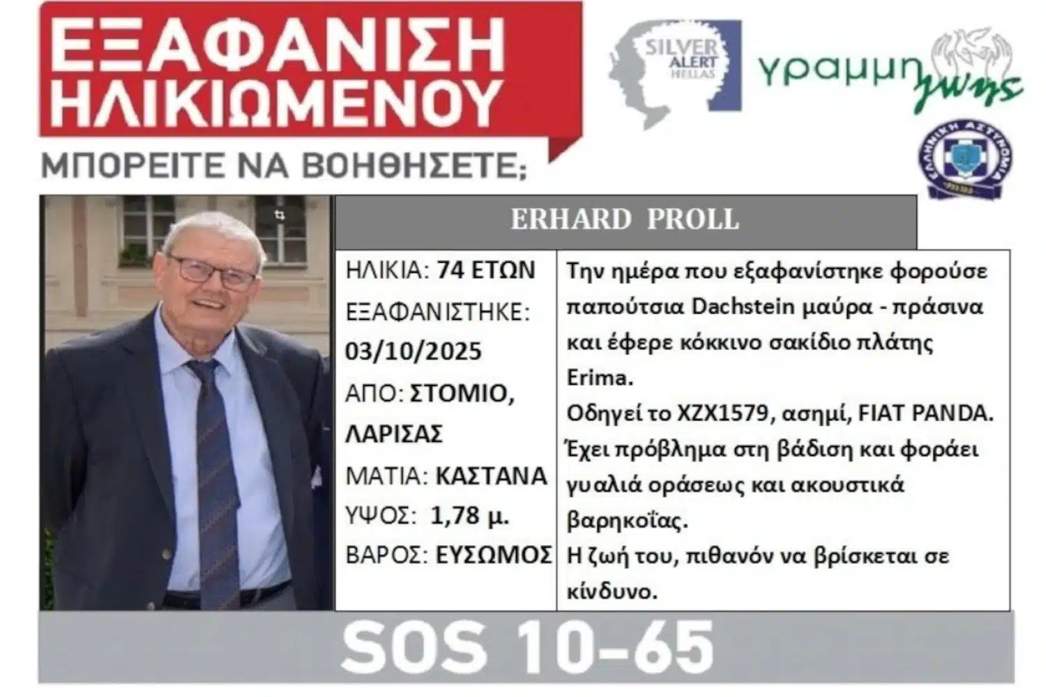 Αναλυτικά το μήνυμα της «Γραμμής Ζωής» αναφέρει τα εξής: «Υπάρχει εξαφάνιση ηλικιωμένου. Ο 74χρονος Erhard Prol (Ερχαρντ Προλ) 74 ετών, εξαφανίστηκε στην περιοχή του Στόμιου Λάρισας, την 03/10/2025.