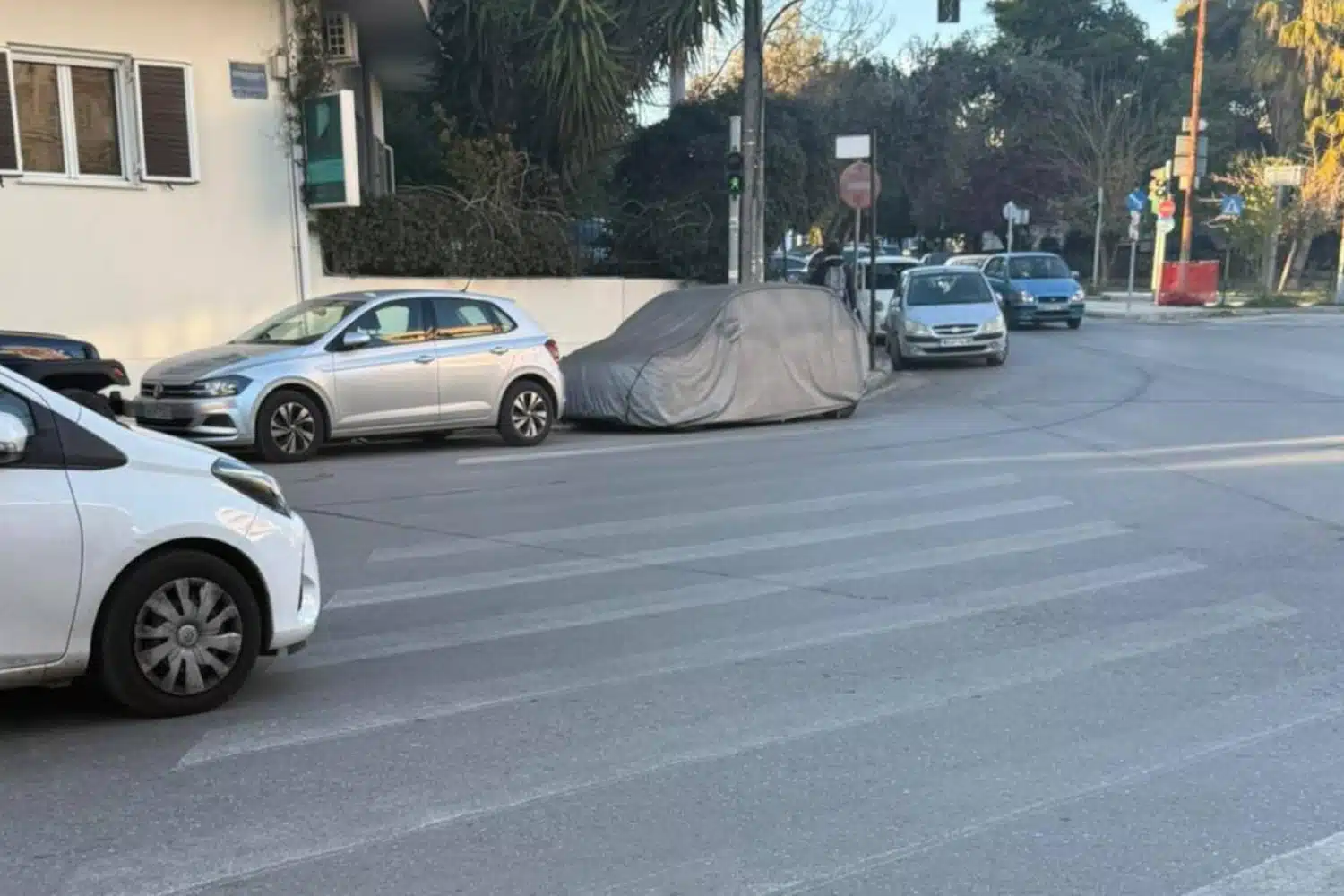 Ο κάτοχος του παράνομα σταθμευμένου αυτοκινήτου το έχει παρκάρει πάνω σε διάβαση πεζών, αλλά σαν να μην έφτανε αυτό, το έχει καλύψει και με κουκούλα, κάτι που θα μπορούσε να σημαίνει ότι σκοπεύει να το αφήσει στο σημείο για μεγάλο χρονικό διάστημα. Εξάλλου σύμφωνα με τον χρήστη του Facebook που δημοσίευσε τη φωτογραφία, το αυτοκίνητο βρίσκεται σε εκείνη τη θέση ήδη τρεις μέρες.