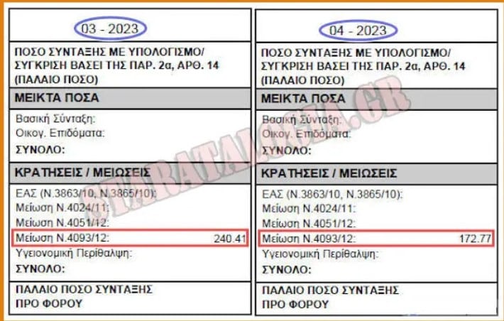 β. Από την αριστερή στήλη αφαιρούμε: Ποσό Μείωσης Ν.4093/12 Μαρ. 2023 – Ποσό Μείωσης Ν.4093/12 Απρ. 2023 και το ποσό (βγάζουμε Υγειονομική Περίθαλψη 6% και Φόρο 20%) που προκύπτει το πολλαπλασιάζουμε επί 27 και βρίσκουμε τα αναδρομικά που πρέπει να πάρουμε ΚΑΘΑΡΑ.