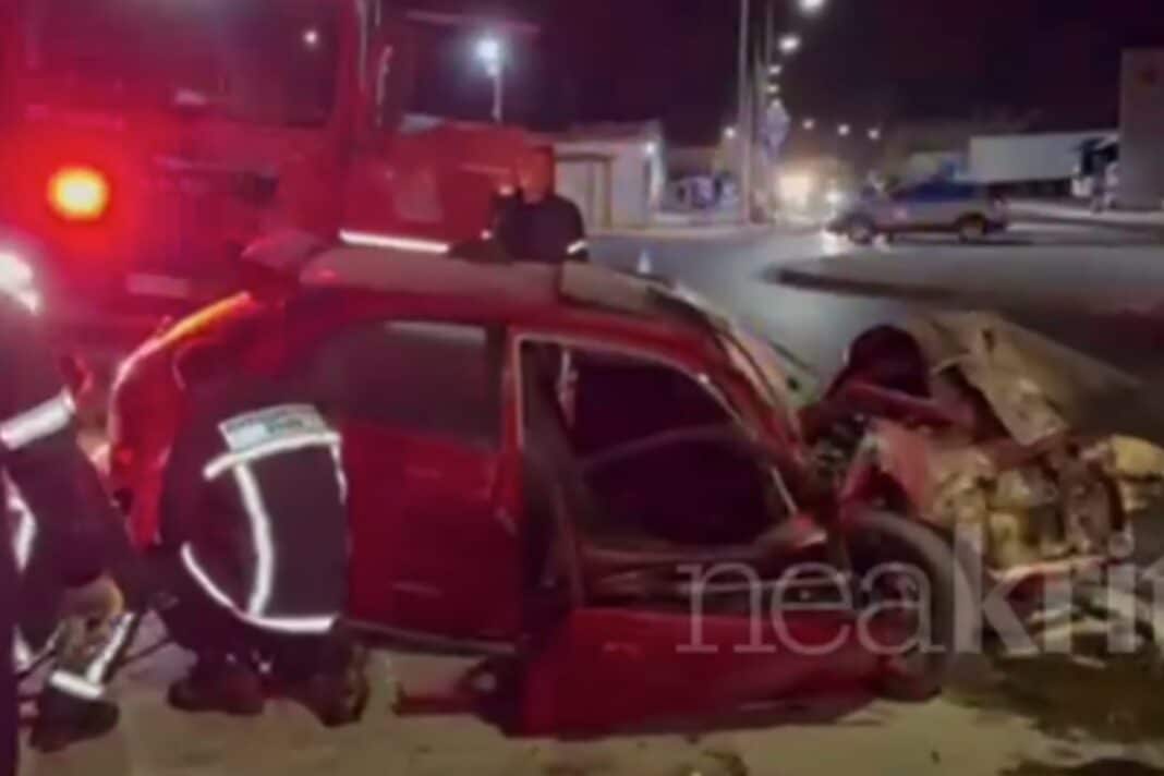 Οι δύο νεαροί επιβάτες του οχήματος εγκλωβίστηκαν στα συντρίμμια και χρειάστηκε η επέμβαση 11 πυροσβεστών με τρία οχήματα για τον απεγκλωβισμό τους.
