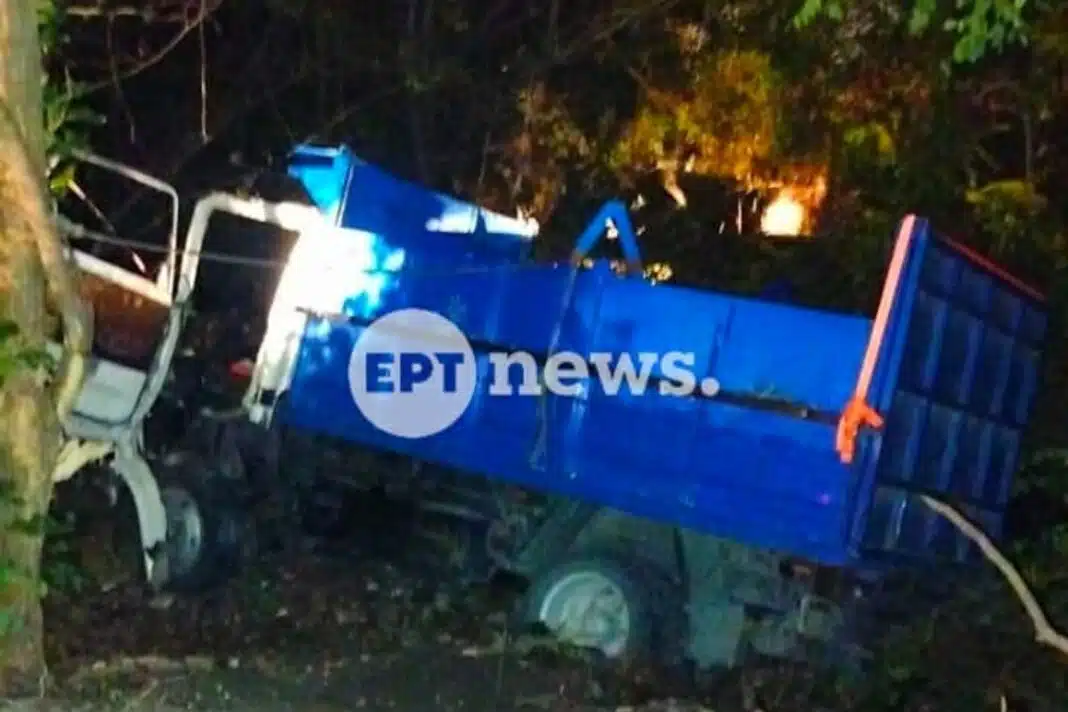 Η σφοδρή σύγκρουση είχε ως αποτέλεσμα το φορτηγό να εκτραπεί της πορείας του και να καταλήξει εκτός δρόμου, μέσα σε παρακείμενο χαντάκι.