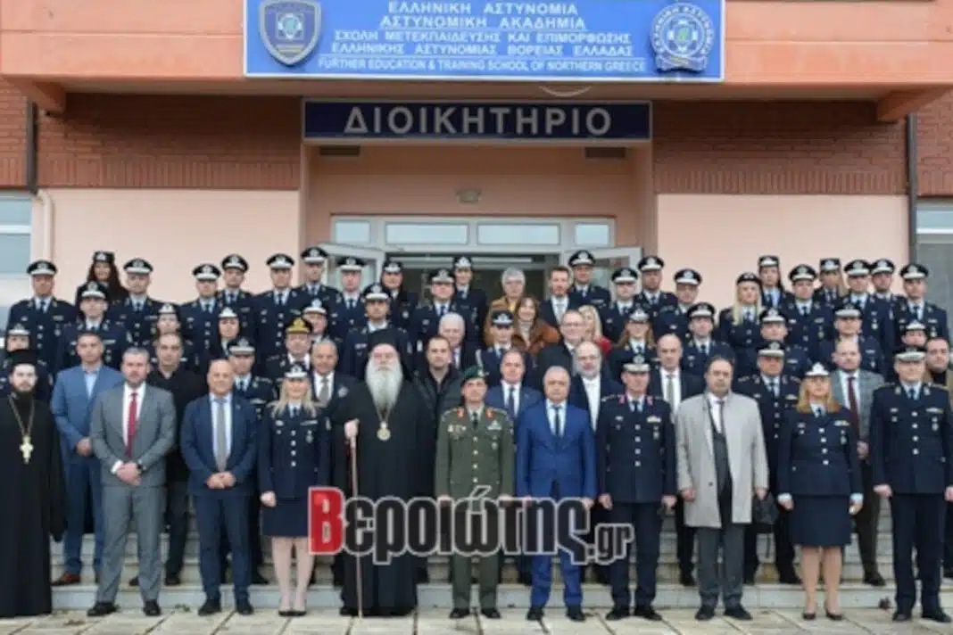 Την Δοξολογία τέλεσε ο Θεοφιλέστατος Επίσκοπος Δομενίκου κ. Αθηναγόρας, την ημερήσια διαταγή ανέγνωσε η Διοικήτρια της Σχολής Μετεκπαίδευσης και Επιμόρφωσης της ΕΛ.ΑΣ. Σοφία Γαϊτανίδου, ενώ χαιρετισμό απηύθυναν ο Υφυπουργός Λάζαρος Τσαβδαρίδης και ο Γενικός Επιθεωρητής Αστυνομίας Βορείου Ελλάδος Αντιστράτηγος Γεώργιος Παπαδόπουλος, οι οποίοι στη συνέχεια απένειμαν τα πτυχία στους 32 Αστυνόμους Α’, καθώς και τιμητικές πλακέτες σε τρεις εκπαιδευτικούς της Σχολής, Μιλτιάδη Σαρηγιαννίδη, Ιορδάνη Κοτζαϊβάζογλου και Δαμιανό Κατραμάδο.