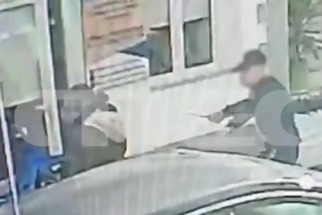 Στο οπτικό υλικό που ήρθε στο φως καταγράφονται τα δραματικά δευτερόλεπτα της επίθεσης, με το θύμα να σηκώνει το χέρι του για να προστατευτεί και στη συνέχεια να μεταφέρεται τραυματισμένο στο νοσοκομείο.