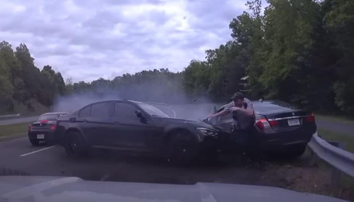 Τα αυτοκίνητα συγκρούστηκαν μετωπικά και το μαύρο σεντάν περιστράφηκε, χτύπησε το δεξί πόδι του αστυνομικού και στη συνέχεια έπεσε πάνω στο περιπολικό. Αν ο αστυνομικός δεν είχε τρέξει, μπορεί να είχε χάσει τη ζωή του ή τουλάχιστον τα πόδια του.