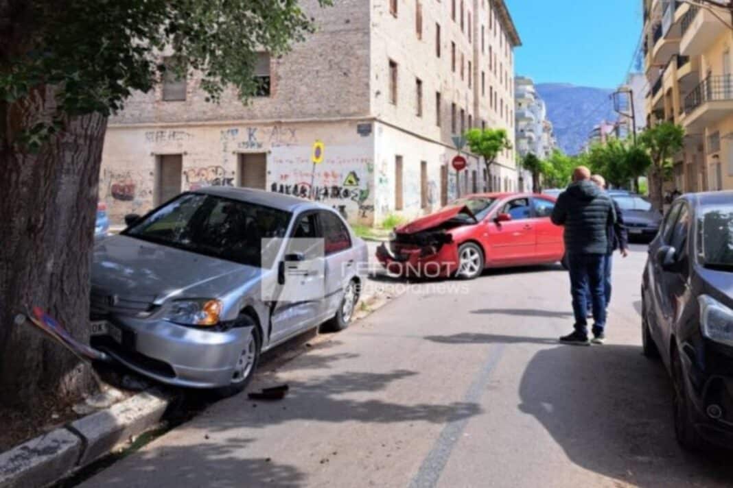 Η οδηγός το πρώτου οχήματος έχασε τον έλεγχο, με αποτέλεσμα το αυτοκίνητό της να «καβαλήσει» το πεζοδρόμιο και να καρφωθεί σε δέντρο, ισοπεδώνοντας την πινακίδα του Κώδικα Οδικής Κυκλοφορίας που υπήρχε στο σημείο.