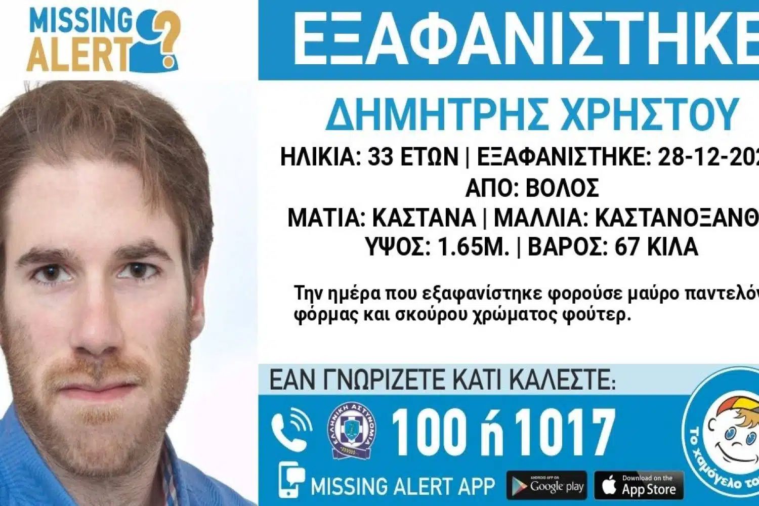Συναγερμός σήμανε στον Βόλο για την εξαφάνιση του 33χρονου Δημήτρη Χρήστου, ο οποίος αγνοείται από το Σάββατο (28/12) στις 12:10 το μεσημέρι.
