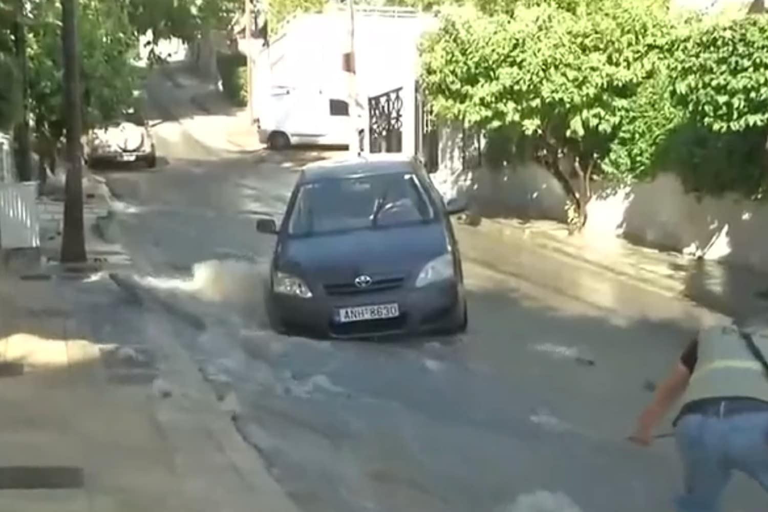 Όπως φαίνεται από τα πλάνα του MEGA, έχει σπάσει αγωγός νερού από το μεσημέρι όπως λένε οι κάτοικοι και κανείς δεν είχε μεριμνήσει.