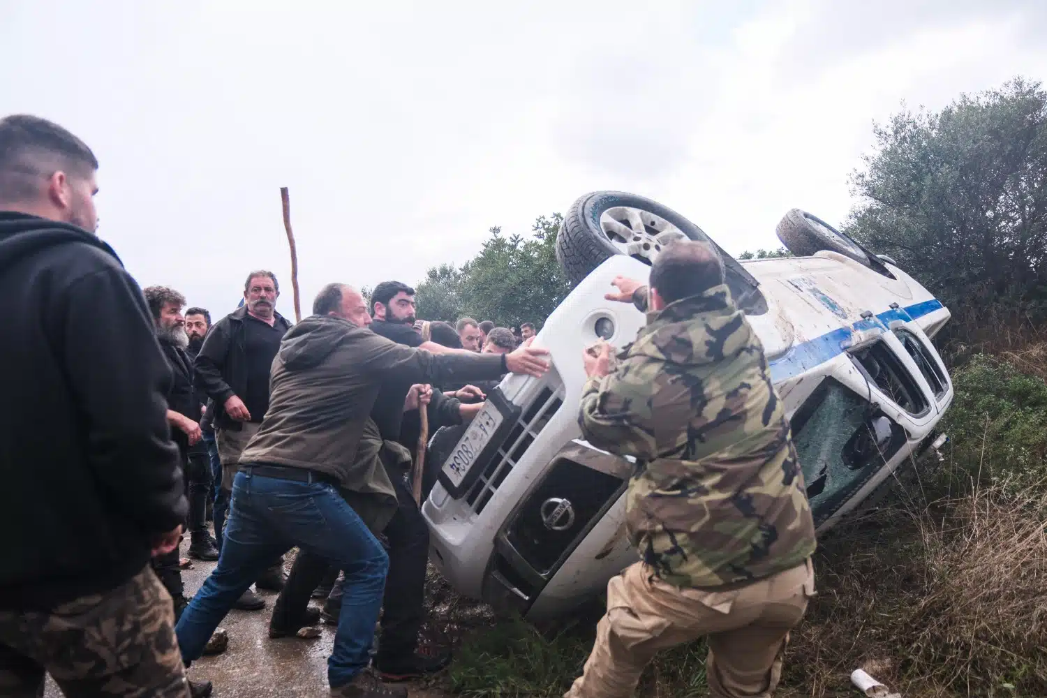 Μάλιστα οι αγρότες κατάφεραν να αναποδογυρίσουν ένα περιπολικό όχημα.