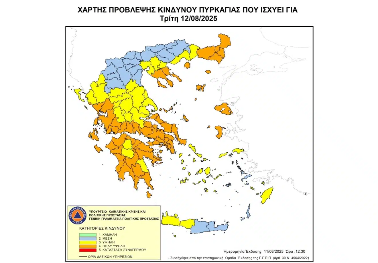 Πολύ υψηλός κίνδυνος πυρκαγιάς προβλέπεται και για αύριο, Τρίτη (12/8) σε μεγάλο μέρος της κεντρικής και νότιας ηπειρωτικής χώρας και το βορειοανατολικό Αιγαίο.