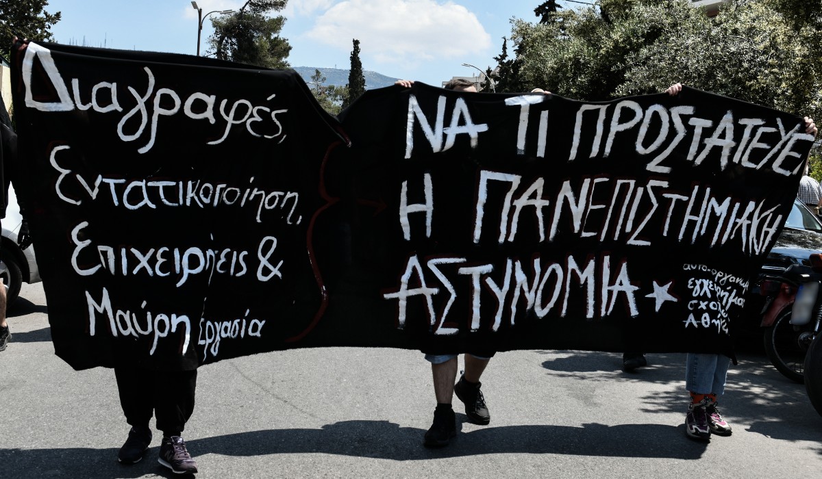Σε πανό που κρατούσαν έλεγαν «Να τι προστατεύει η Πανεπιστημιακή Αστυνομία: Διαγραφές, εντατικοποίηση, επιχειρήσεις και μαύρη εργασία», ενώ η πορεία κινήθηκε στους γύρω δρόμους.